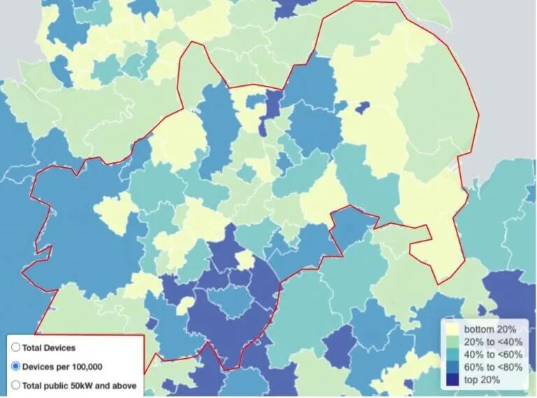 The Midlands represents 20% of the UK’s population, encompassing about 64 councils. Public EV charger distribution varies wildly across its councils, from North-East Derbyshire with just 21 chargers to Coventry City with an impressive 638 per 100,000 people (though the median is just 64). That represents a total of 13,000 chargers.
