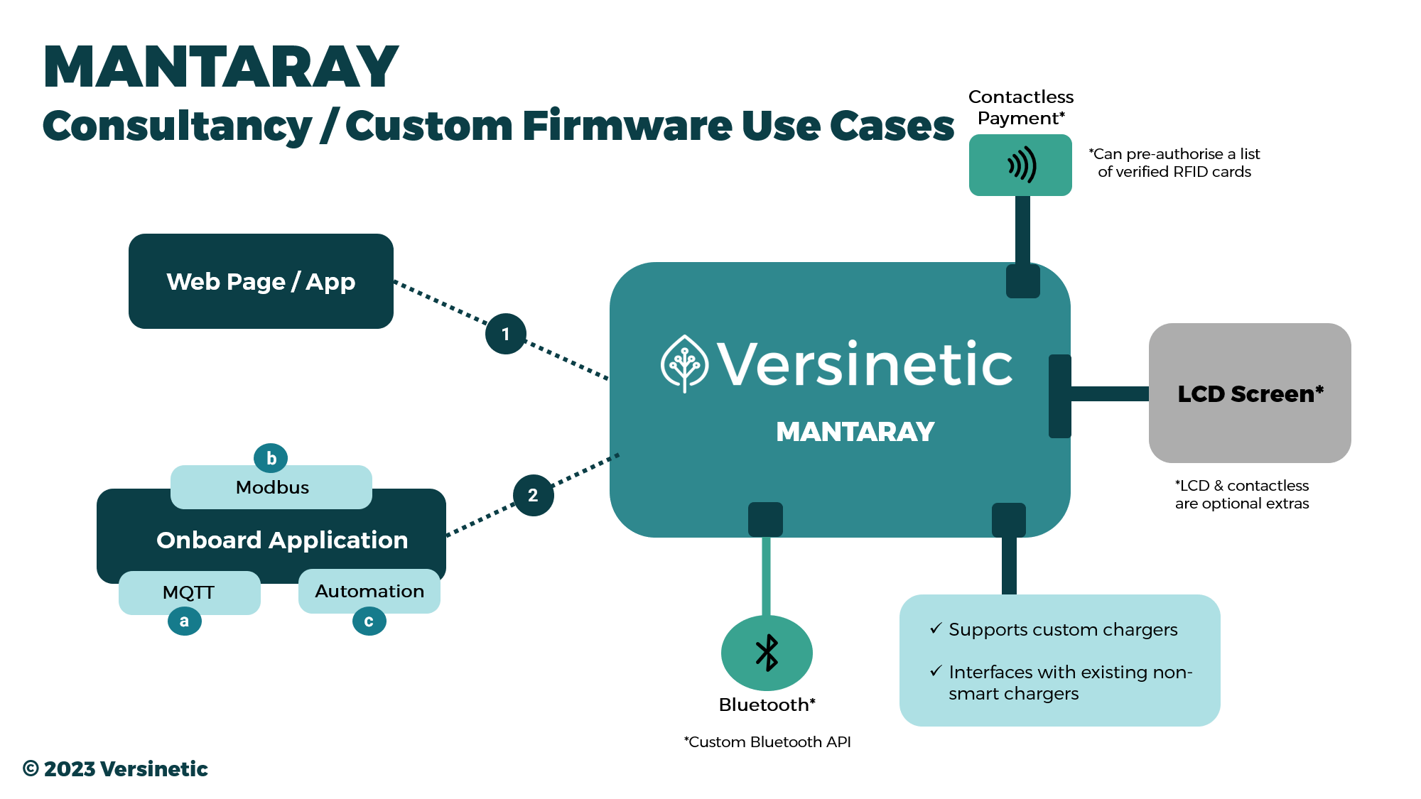 Use MantaRay to manage AC and DC Charge Points with OCPP 1.6 and your own back-office solution. Versinetic offers complete versatility, and therefore will support you in either integrating this technology into your own systems, or in building a completely bespoke solution using our own charging blox.