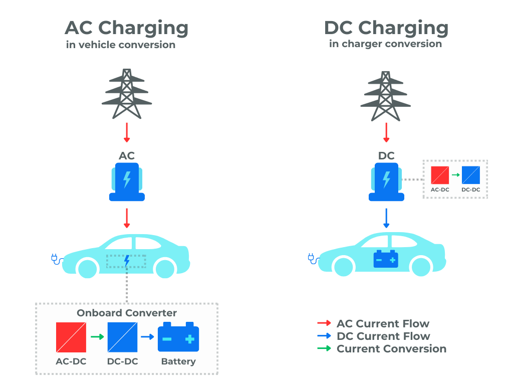 AC Charging uses alternating current directly from the grid. It’s the most common type of charging and is what you’ll typically find in homes and many public locations. AC chargers require the vehicle’s onboard charger to convert AC to DC for battery charging.