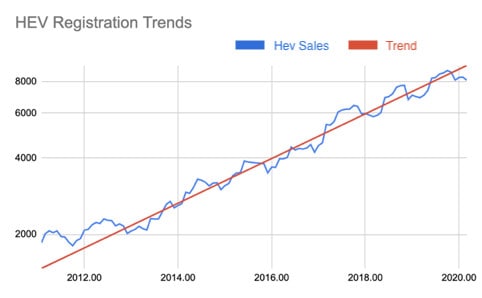 The graph is a log graph with the trend line based from 2013 where the growth rate clearly accelerates. We can see that aside from the dip in 2016, Hybrid peak growth happened from 2017 to the beginning of 2019. However, the most telling sign that Hybrids are, or will peak soon is that the April 2020 registrations for Hybrids in the wake of the Coronavirus pandemic, exhibited the greatest fall of all segments, a full 99.3%; while BEV sales were propelled to around 32% of all registrations for that month.