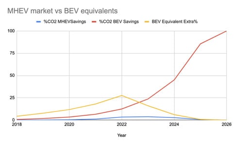 We can make some predictions for them too based on two simple observations: MHEVs improve fuel efficiency by 5% to 10% and (at least at the low end) they work by combining the starter motor and alternator [5]. Assuming that vehicle usage will remain pretty constant between now and 2050 (when transport emissions need to reach zero), then we need to save about 3.3% of emissions per year. But MHEVs can’t achieve that. With current growth rates of MHEVs and BEVs, maximum savings occur in 2022-2023, and this is only equivalent to boosting BEV sales by a maximum of 28% in that year.