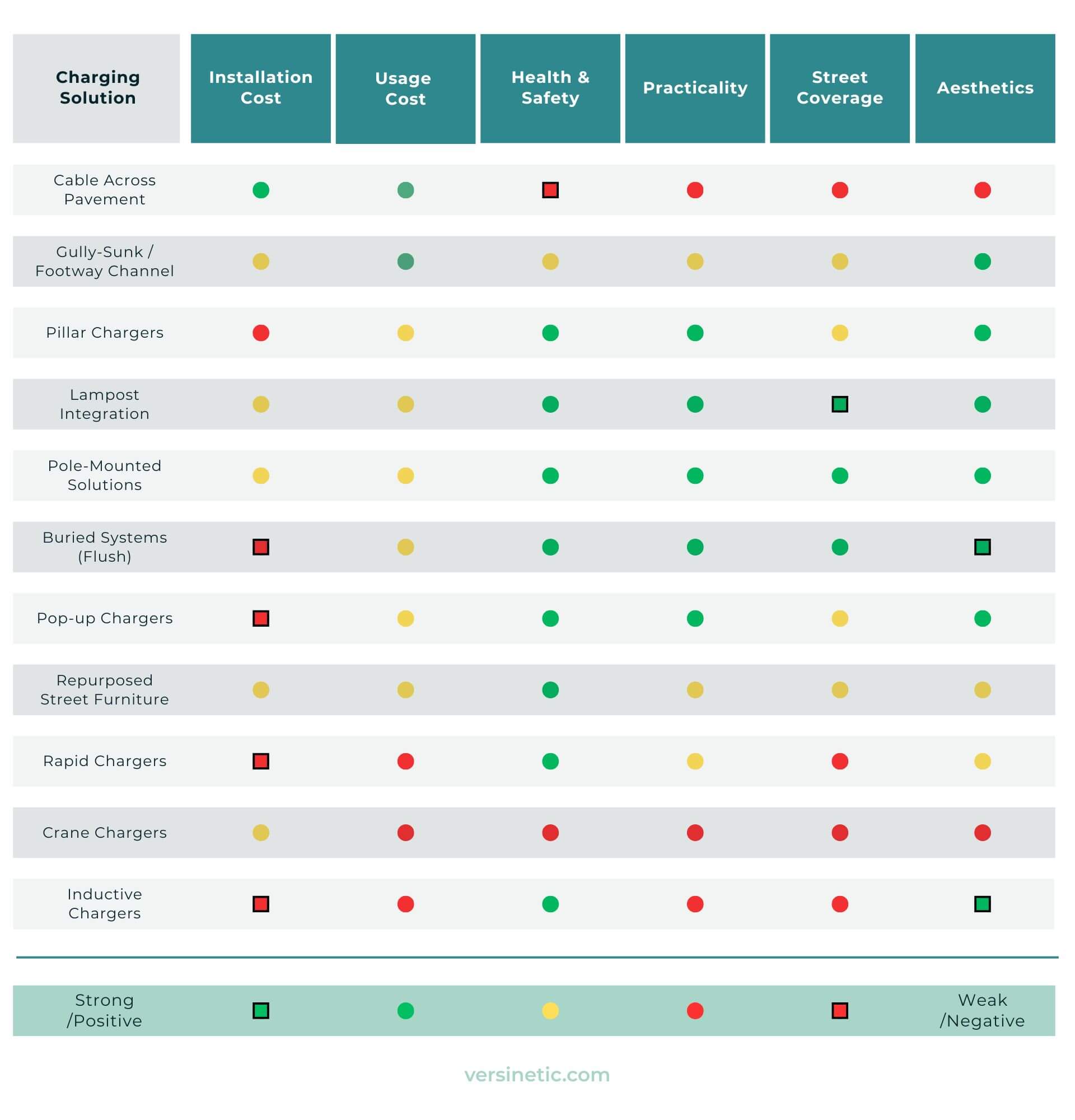We’ve created a heatmap of the different types of EV Kerbside charging, along with how they score across the 6 key challenge criteria.