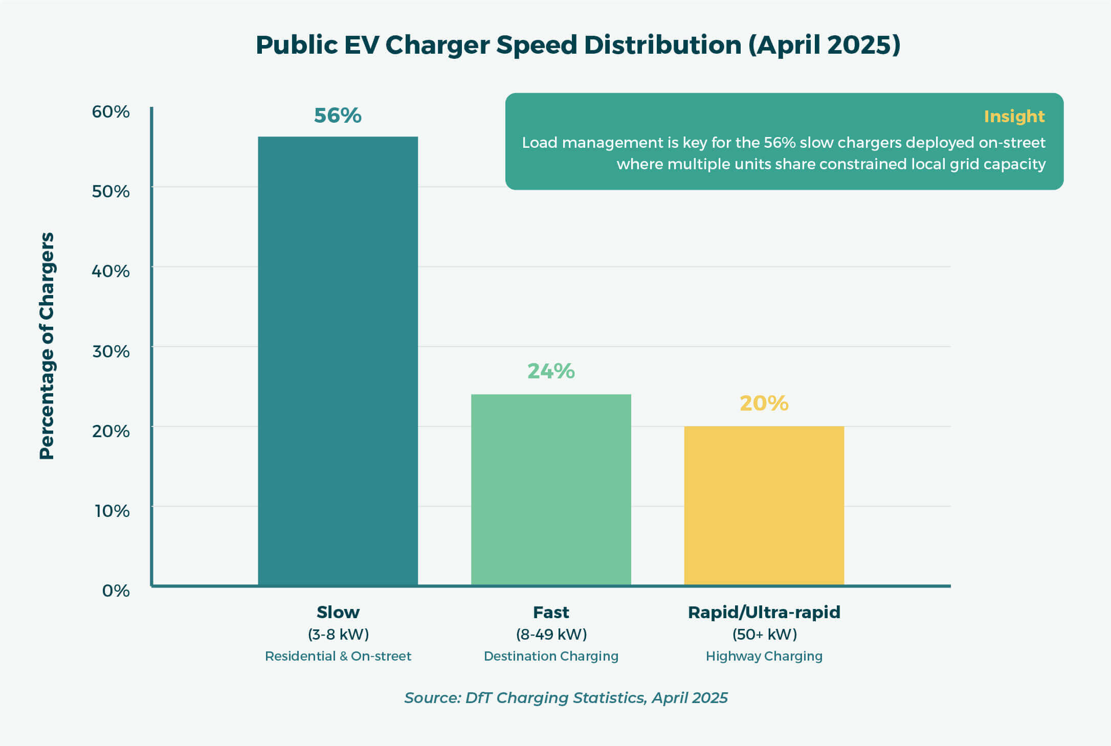 - Dominance of Slow Charging: 56% of all UK public chargers are slow-speed (3-8 kW) units deployed on-street. For these installations, intelligent power-sharing between multiple units is an immediate operational necessity.