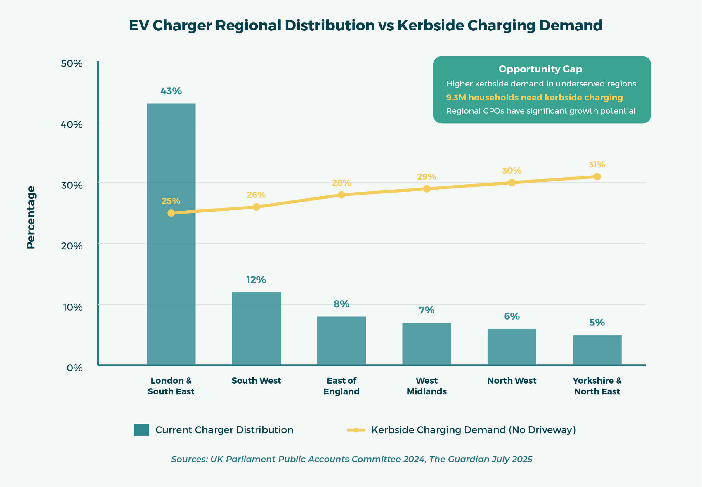 - The Market Opportunity: A major opportunity gap exists in regions outside of London and the South East. Kerbside charging is the only viable option for 9.3 million UK households that do not have a driveway.