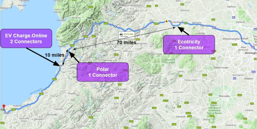 …the next rapid charging point was 70 miles away across the Welsh mountains, it was a type we’d used before, the car reported a fault when trying to connect; so then we had to drive another 10 miles to Aberystwyth for a 22KW AC charger which had a web interface that required pre-payment. Frustratingly, the identifiers for the charging points didn’t match the information on the screen, which also kept scrolling out of view and the post only provided a few LEDs to help.